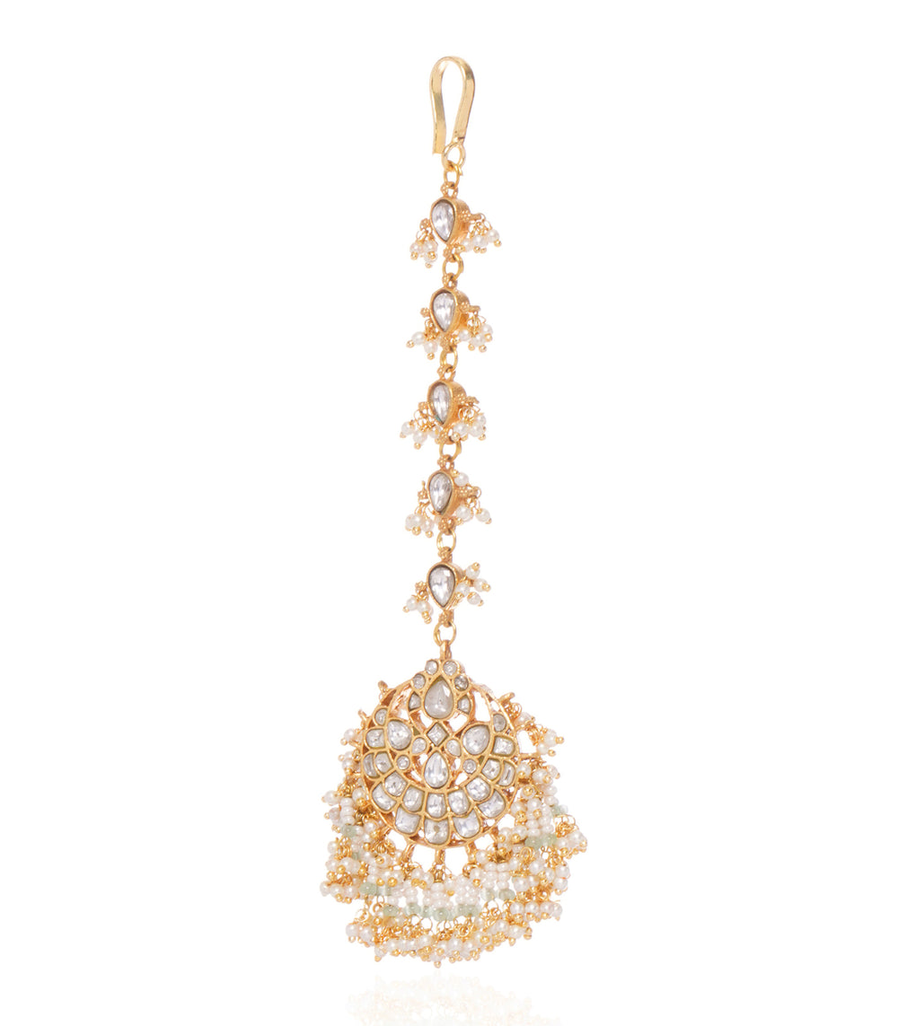 A dramatic brass maangtika, gold-plated with intricate kundan work, featuring elegant green onyx pearls as drops. The design showcases a powerful Indian princess, adorned in exquisite jewelry, making it a bold statement piece.