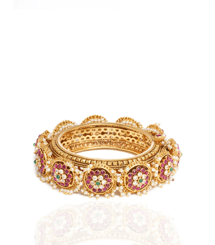 Experience elegance with these exquisite bangles adorned with ruby and emerald kundan stones, gold-plated on alloy base. Inspired by floral abstracts, they boast a unique and beautiful design, complemented by delicate pearl strings for a touch of sophistication.