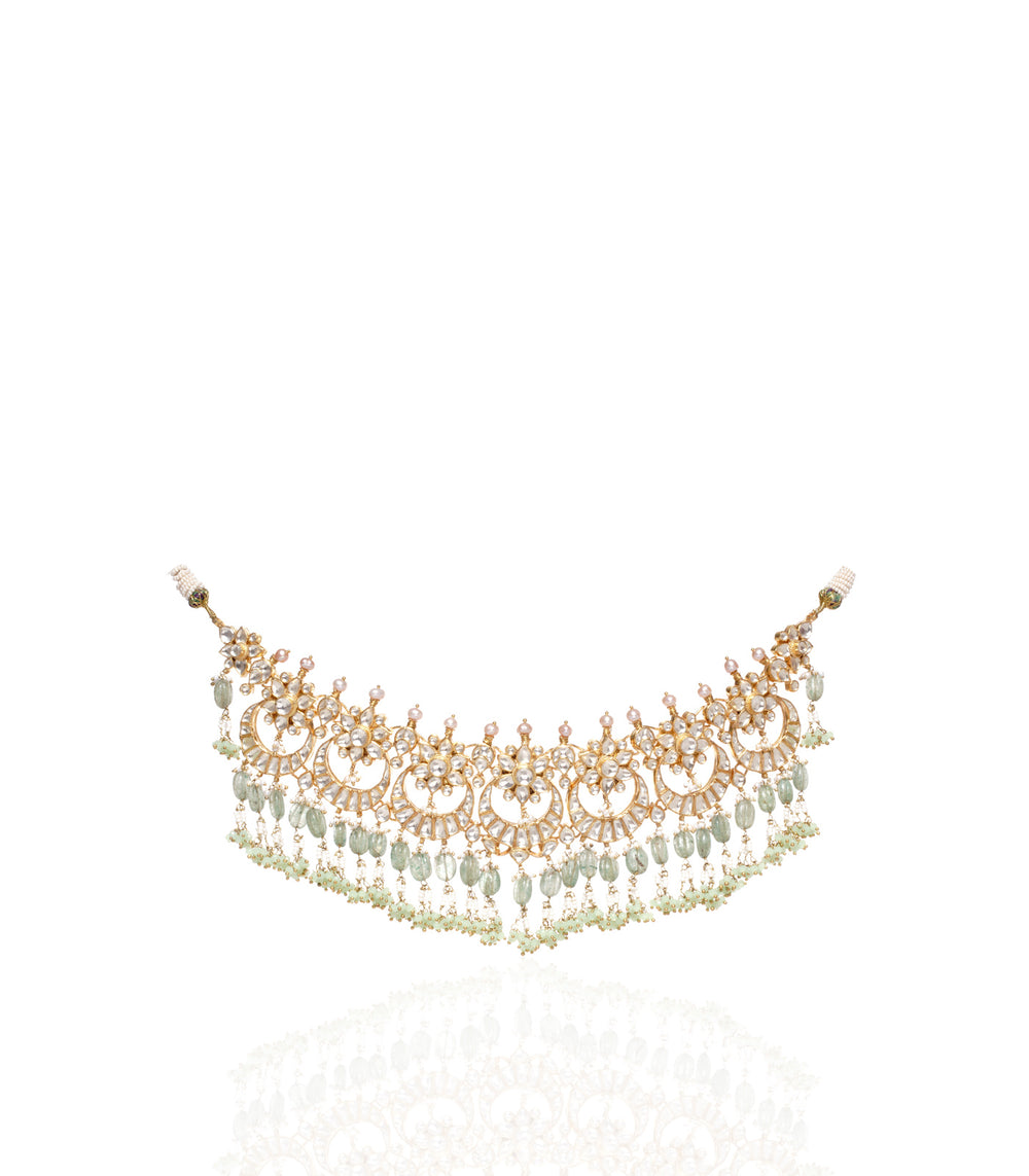 Experience regal allure with our exquisite necklace set. Crafted with kundan stones and plated in gold, it radiates timeless elegance. The royal touch is elevated with drops of lush green onyx and delicate aqua green, creating a captivating and beautiful design.
