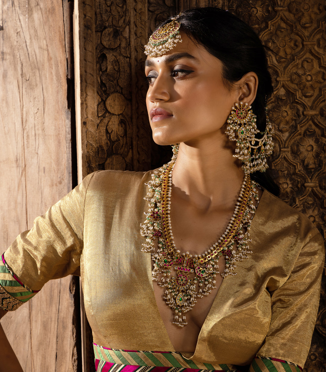 Handcrafted Detailing – Fine work in kundan, polki, moissanite, jadau, gota patti, and pearls.