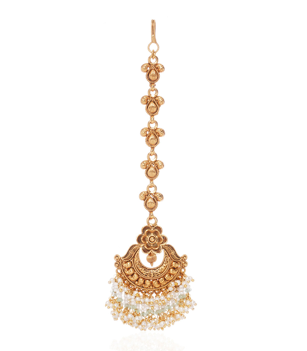 An alluring kundan maangtika crafted in brass with a rich gold plating, featuring an intricate statement design inspired by a regal Indian princess. Adorned with delicate pearl drops, this timeless piece captures elegance and royal charm.