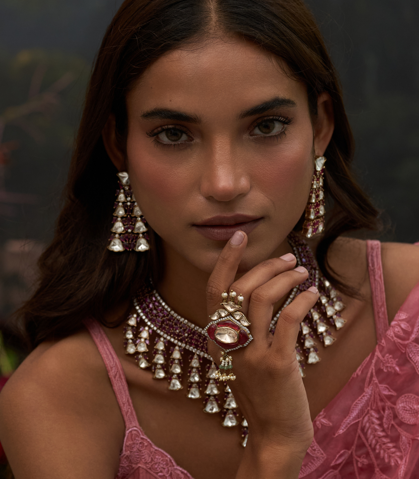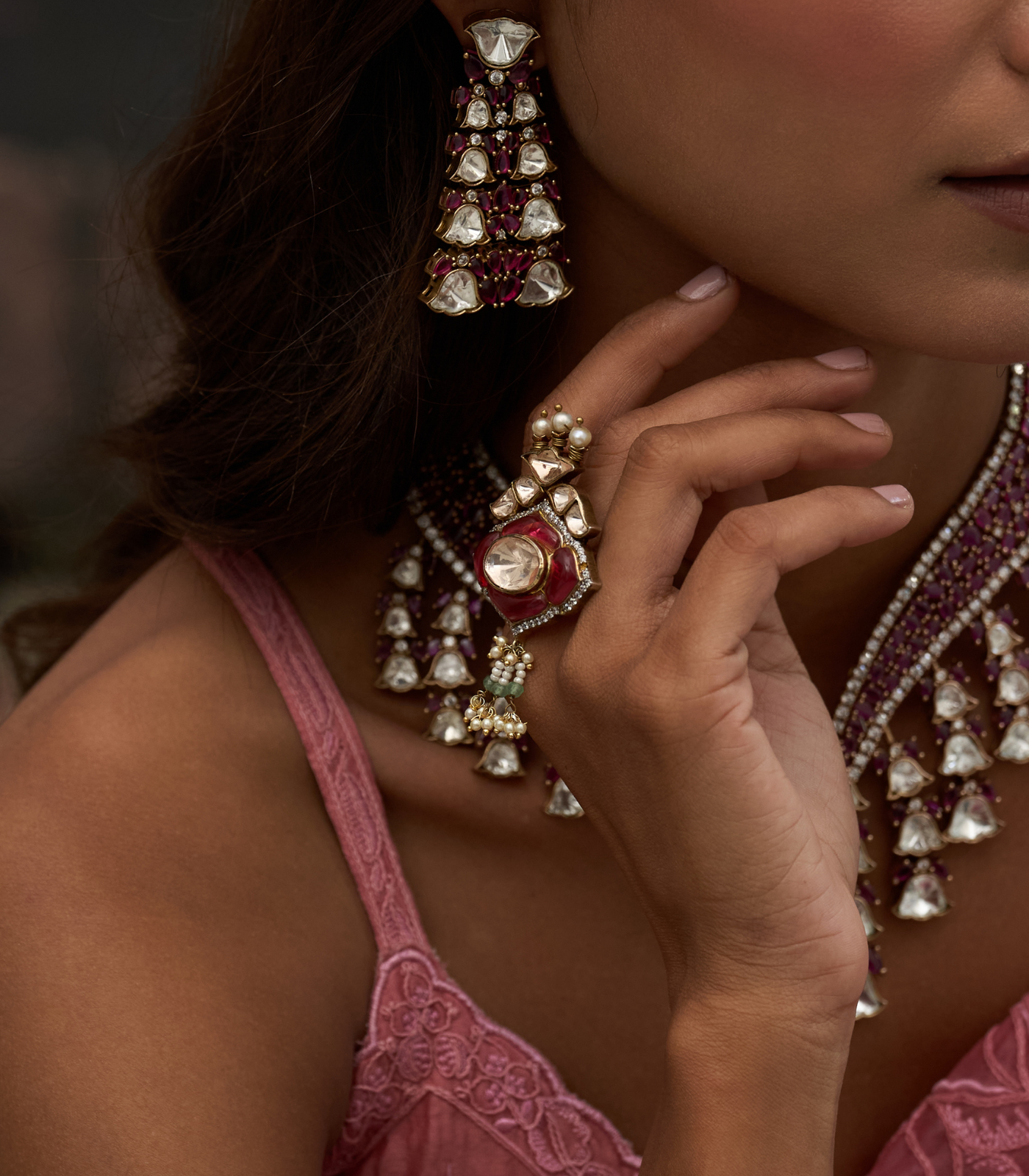 Explore regal beauty with our Moissanite and Ruby Ring, inspired by Mughal art. The gold finish on sterling silver, coupled with brilliant moissanite and vibrant ruby stones, pays homage to the elegance and opulence of a rich cultural heritage.