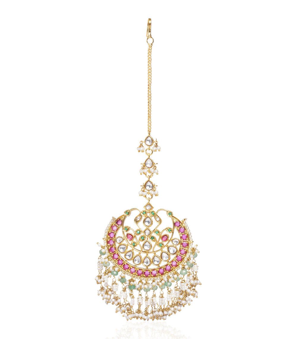 Adorn yourself in regal allure with our Kundan Stone Mangtika. Embellished with captivating green onyx, opulent ruby, and graceful pearl drops, its majestic design and gold finish exude timeless royal charm.