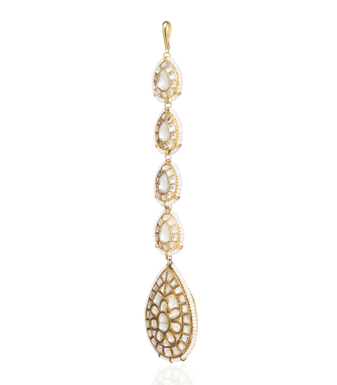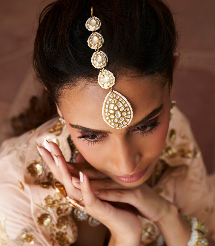 Elegantly crafted simplicity meets golden royalty in our Kundan Mangtika. Gold-plated for regal allure, this piece reflects a perfect fusion of sophistication and royal enchanment.