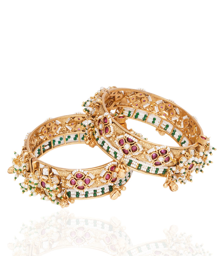 Wrap your wrists with our Gold-Plated Kundan Bangles, featuring vibrant red and green Kundan pieces delicately outlined by tiny pearl strings. This exquisite blend of colors and textures exudes timeless elegance, making a statement of grace and sophistication.