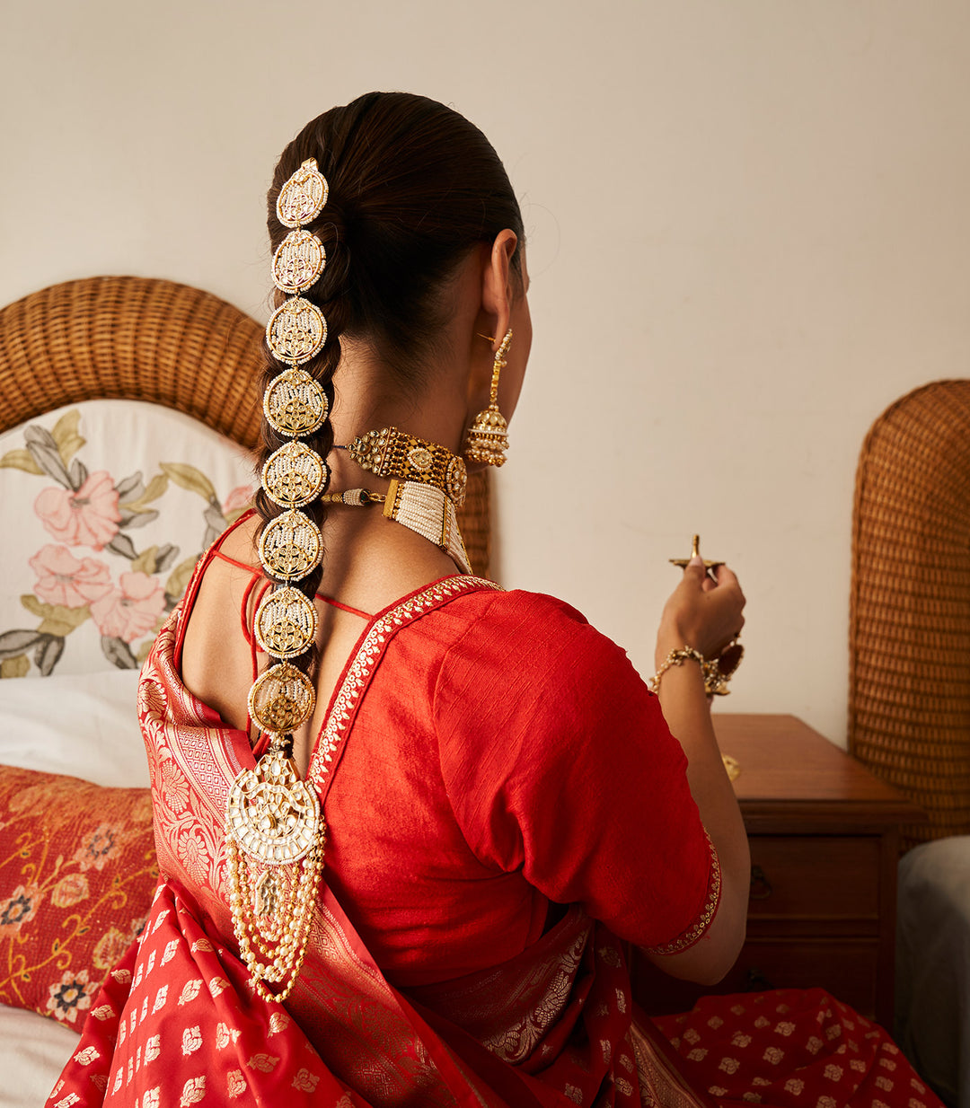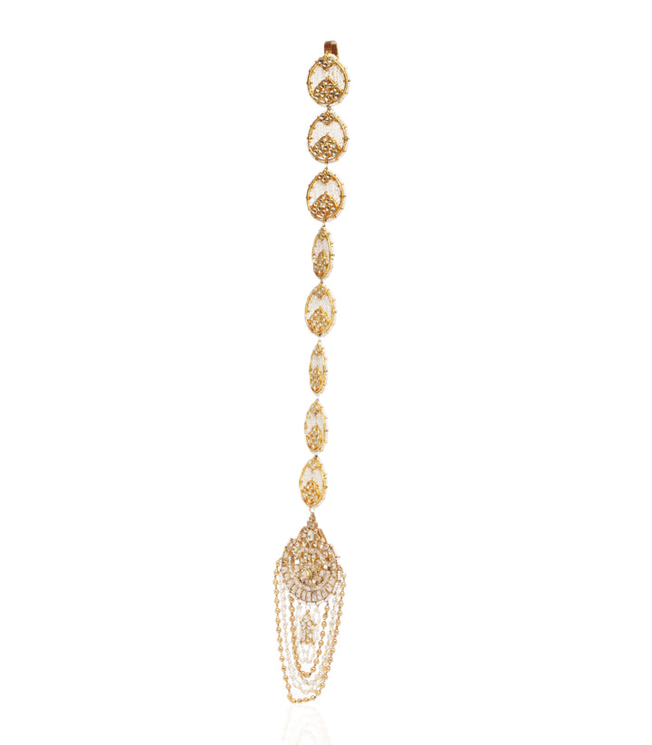 Uprise your braid with our Gold-Plated Kundan Choti Accessory, adorned with intricate Kundan pieces, delicate pearls, and golden balls. A perfect blend of opulence and grace for a stunning hair statement.