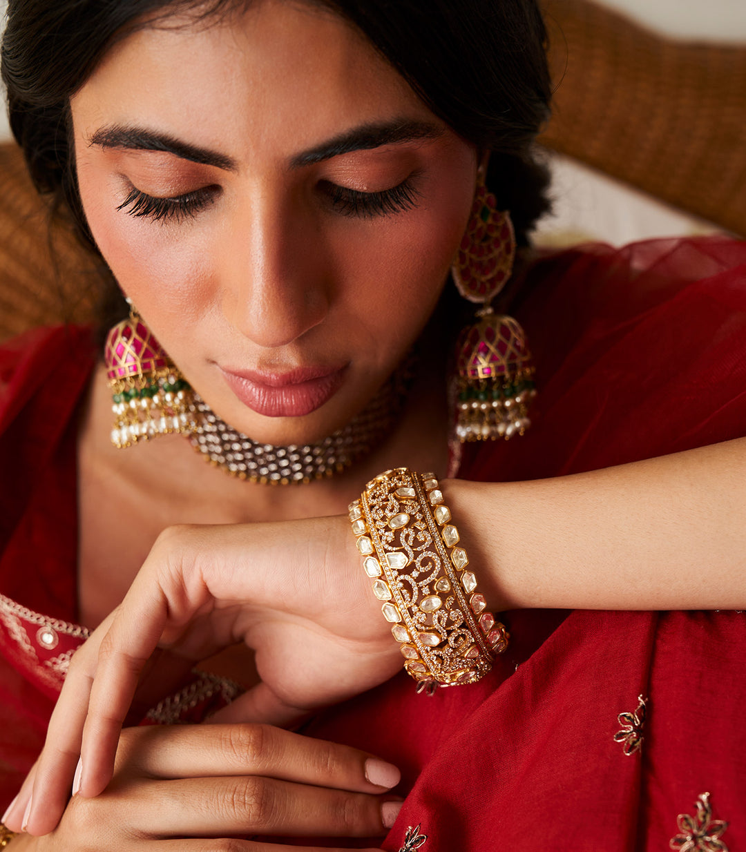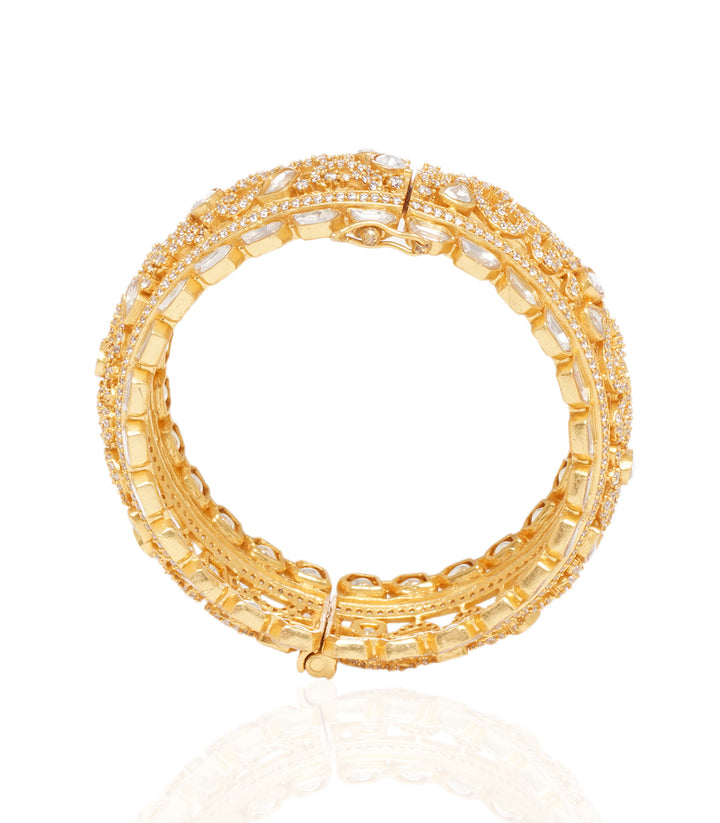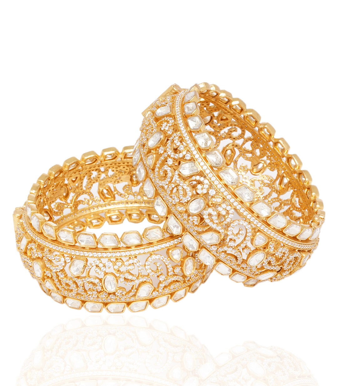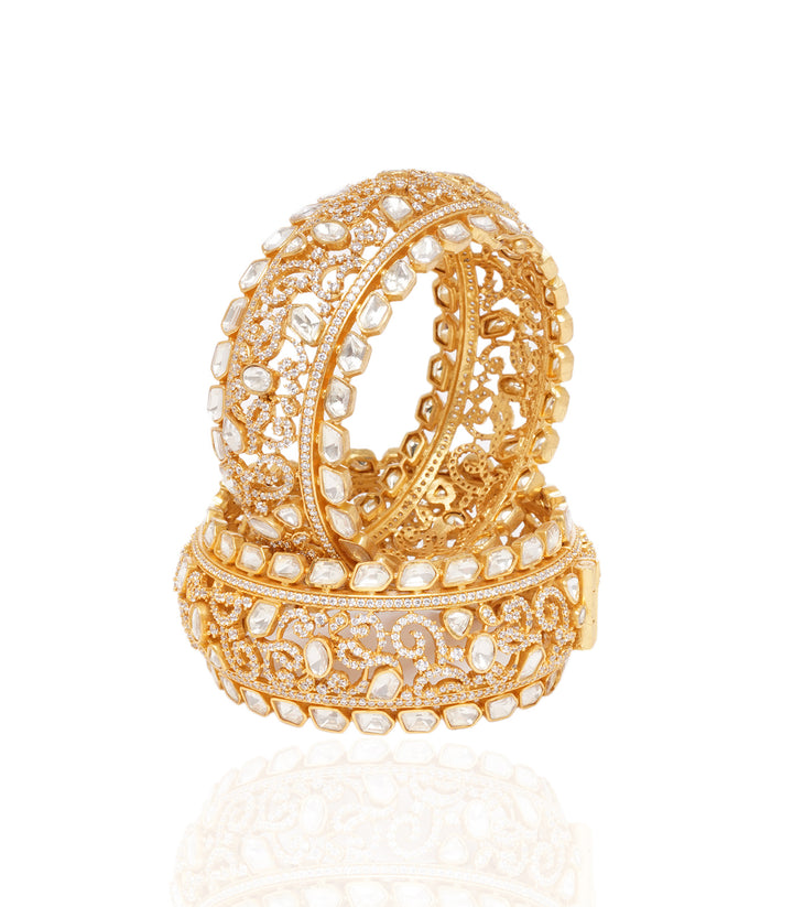 Illuminate styling your outfit with our chic bangle set, adorned with sparkling clear moissanite stones and elegantly gold-plated on silver for a touch of glamour. A perfect blend of sophistication and luxury for any occasion.