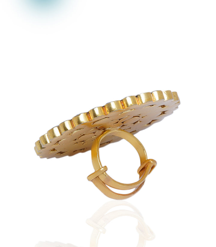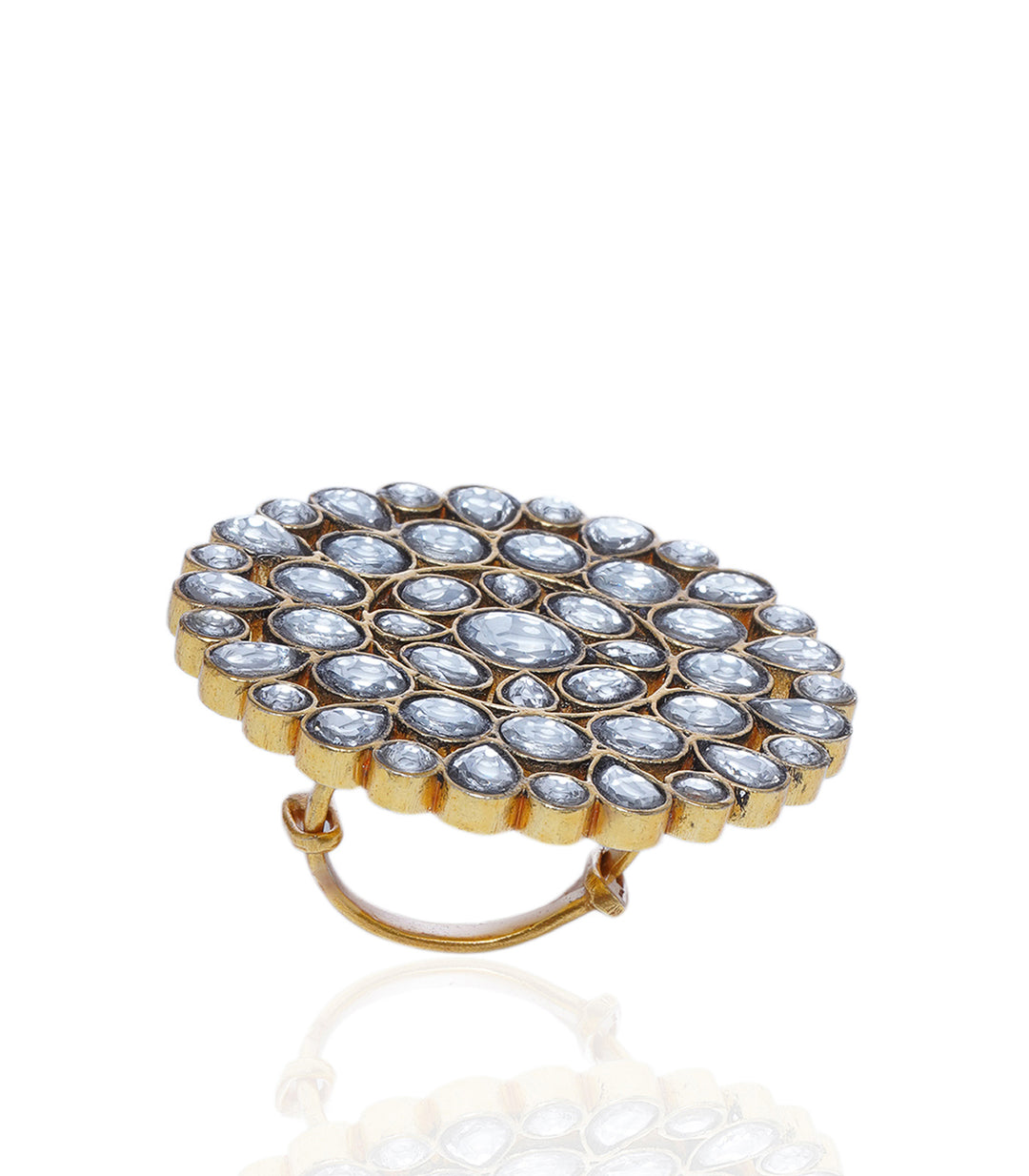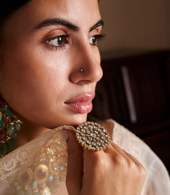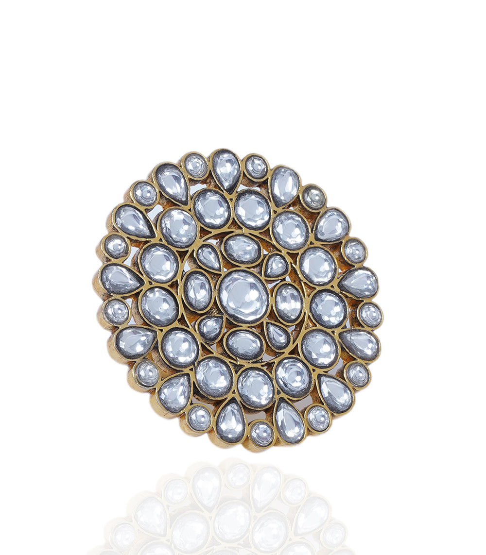 Experience divine elegance with our Gold-Plated Kundan Ring, meticulously crafted with an array of Kundan pieces forming the enchanting pattern of the Flower of Life. This ring harmoniously combines intricate design with timeless beauty, adding a touch of sacred geometry to your style.