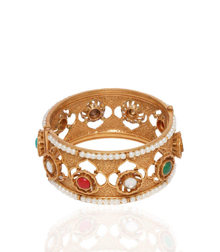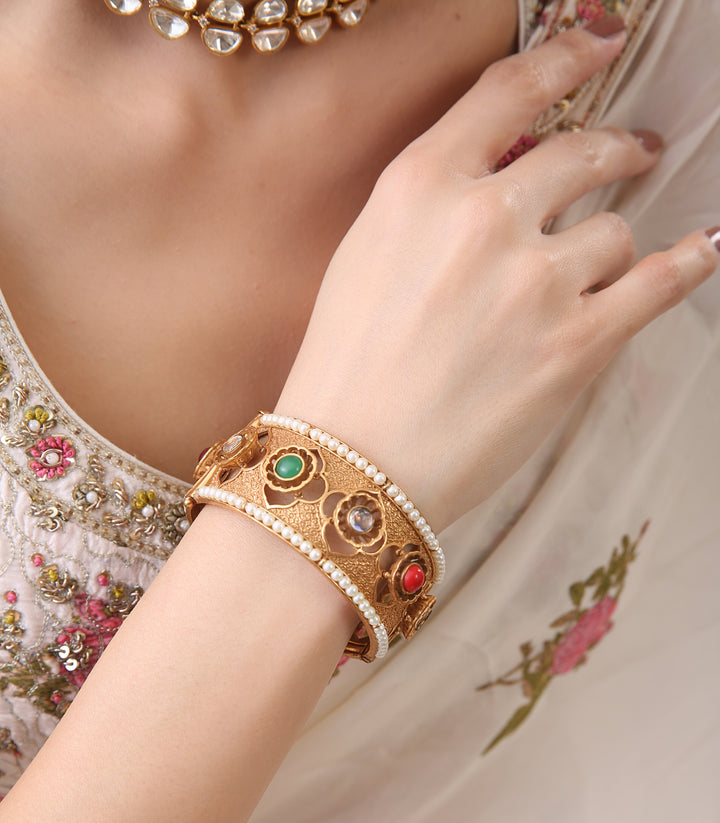 Pamper yourself in regal elegance with our Gold-Finished Navratan and Kundan Bangle. Delicately outlined with tiny pearls, this bangle exudes a royal charm, combining tradition and opulence for a truly majestic feel.