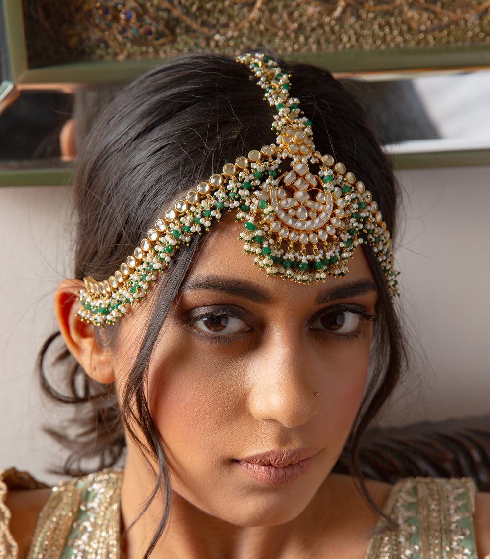 Complete your traditional ensemble with our Kundan Mathapatti. Adorned with white and green kundan stones, pearls, and gold finish, it features a timeless design with pearl and green onyx drops for an elegant touch.