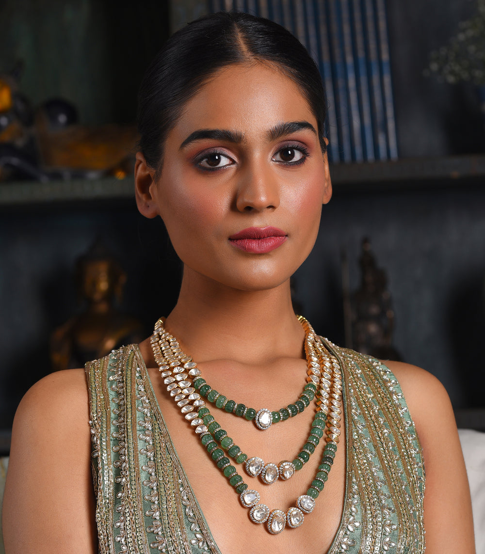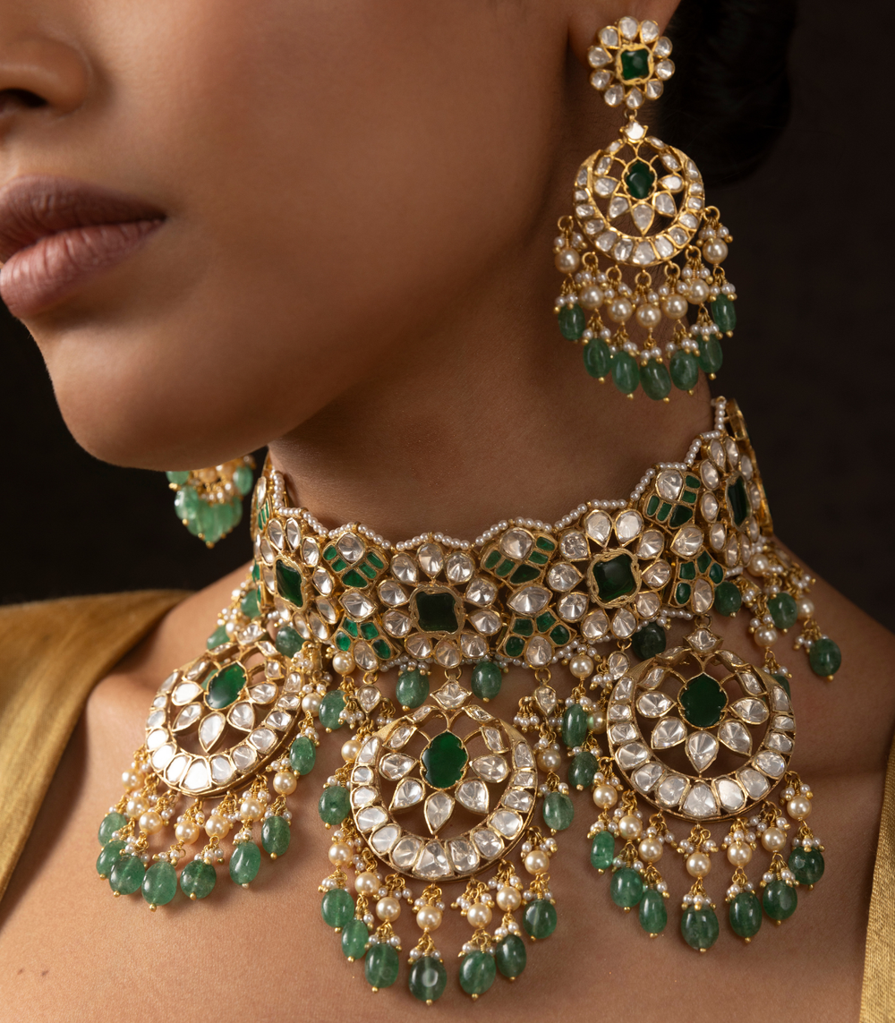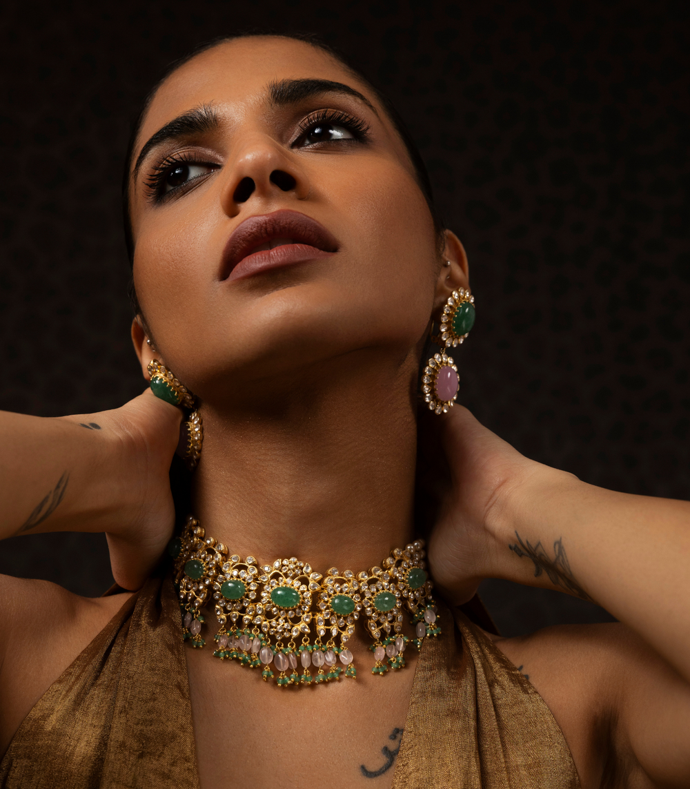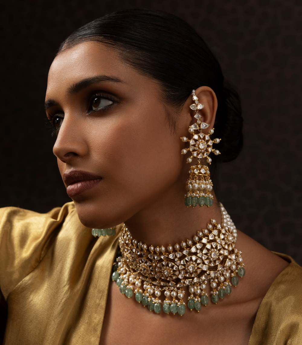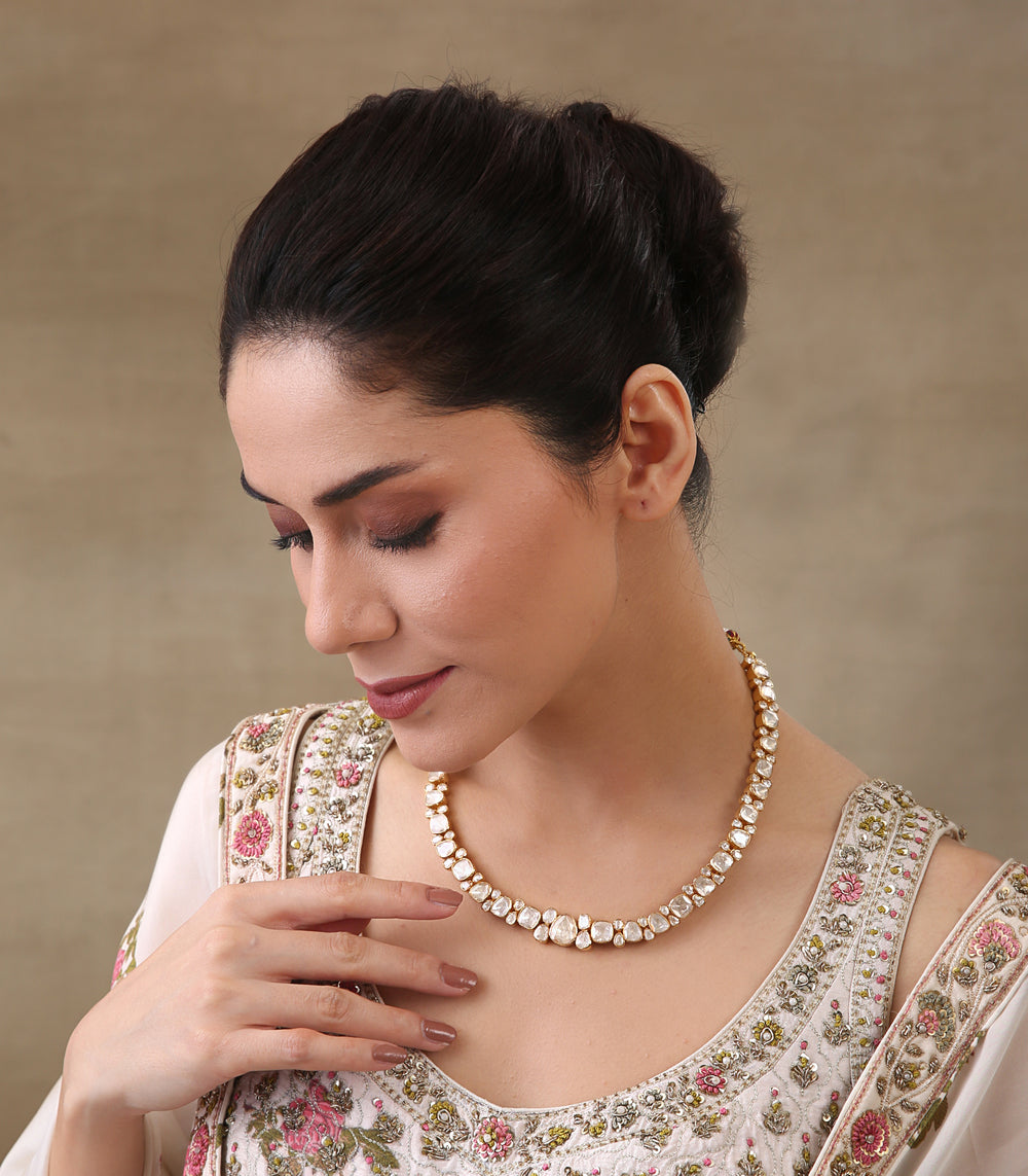 Moissanite jewellery, a dazzling alternative to traditional polki boasts exceptional brilliance and durability. Composed of silicon carbide, it offers a stunning play of light, making it a popular and affordable choice for fine jewellery.