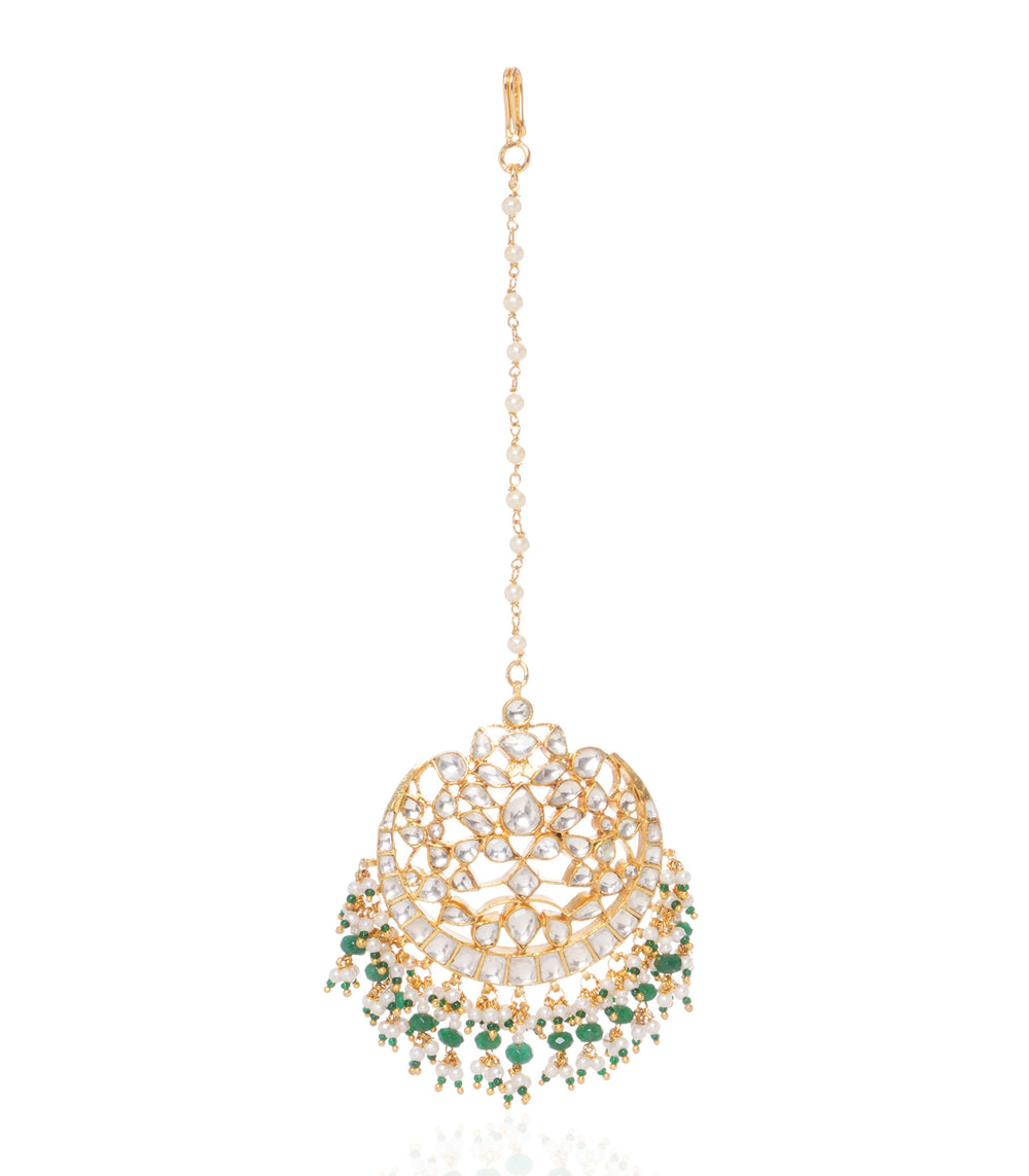 A regal Kundan maangtika crafted in brass and gold-plated for a luxurious finish, featuring an intricate statement design inspired by a powerful Indian princess. Adorned with shimmering green onyx pearls as delicate drops, it exudes timeless elegance and royal charm.