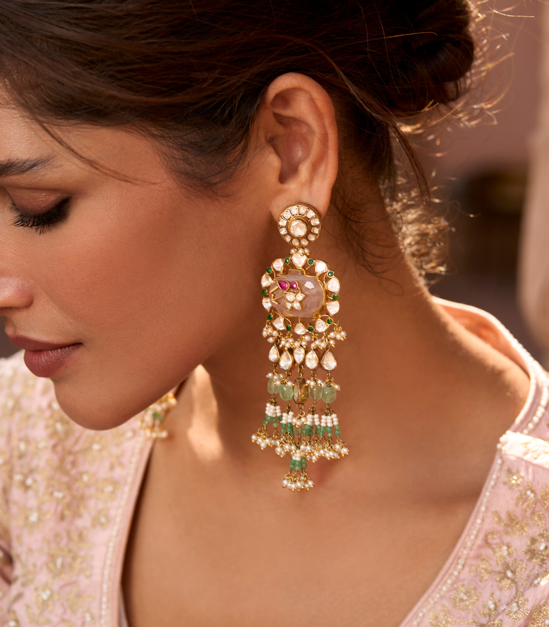 These unique Moissanite earrings feature detailed stones set on onyx, with delicate tiny green and white jhallars as drops. The beautiful and intricate design creates a stunning statement, making these earrings a perfect blend of elegance and charm.