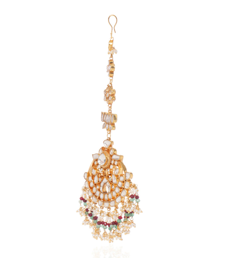 A chic brass maangtika, gold-plated and adorned with kundan stones, features graceful pearl drops. The couture-inspired design is elevated with a delicate string at the top, adding an elegant and sophisticated touch.