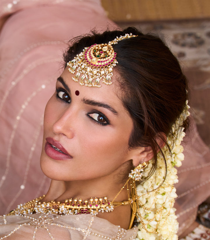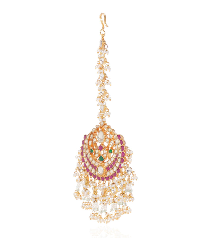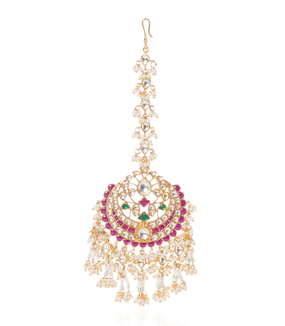 A stunning kundan maangtika crafted in brass with a luxurious gold-plated finish, featuring delicate pearl drops. The statement design embodies the regal essence of an Indian princess, adorned with intricate jewelry for a bold, royal touch.