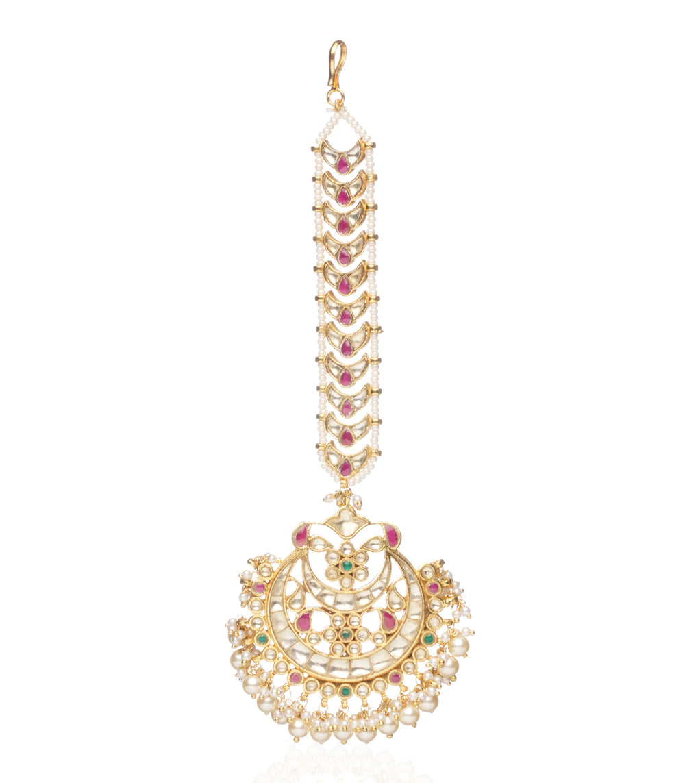 Glam your look with our Kundan Stone Mangtika. The gold finish, adorned with delicate pearls and outlined by tiny pearl strings, adds a touch of elegance to this accessory. The pearl drops enhance its beauty, creating a stunning and sophisticated piece.