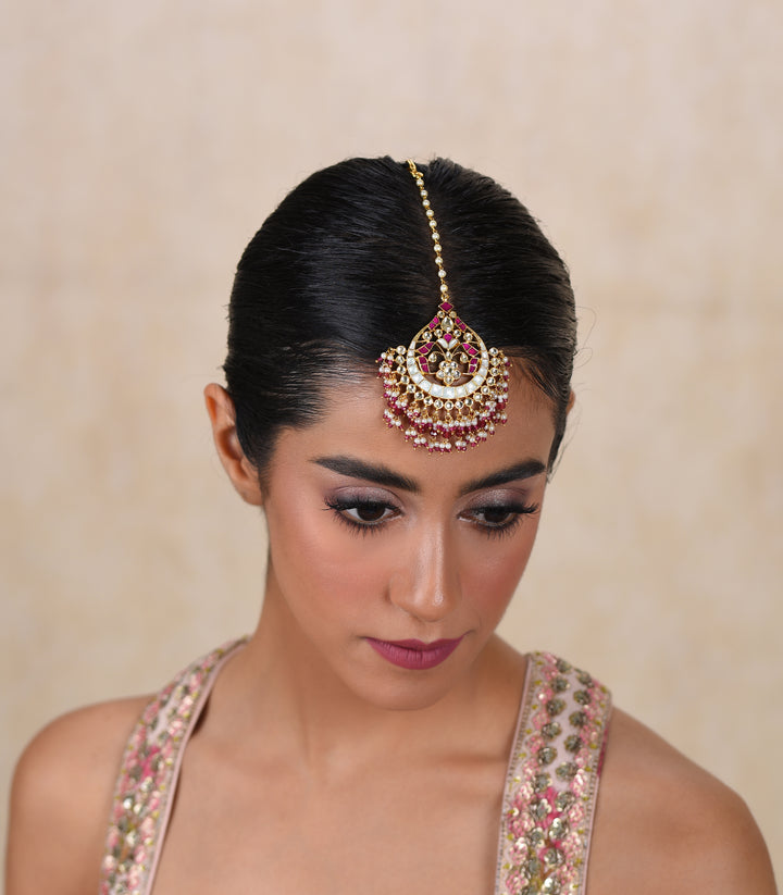 Evoke vintage glamour with our Antique Gold-Plated Kundan Maangtika, adorned in mint and red Kundan stones. Enhanced by enchanting green onyx fluorite drops, this piece captures an era of timeless sophistication, adding a touch of allure to your ensemble.
