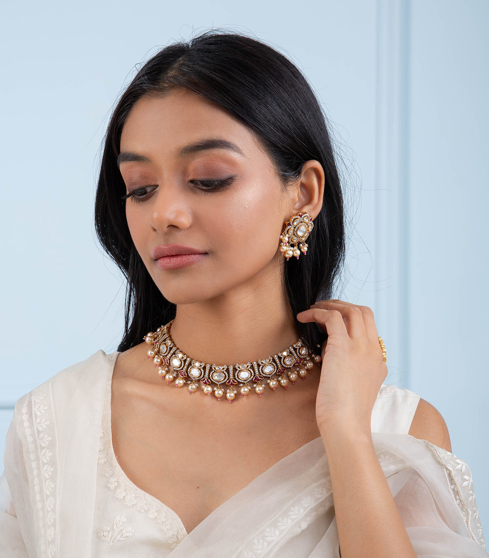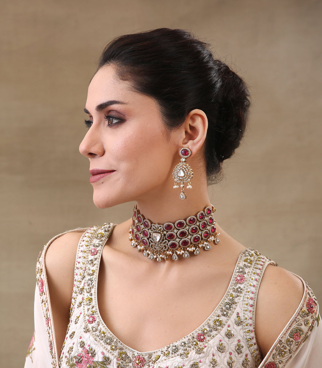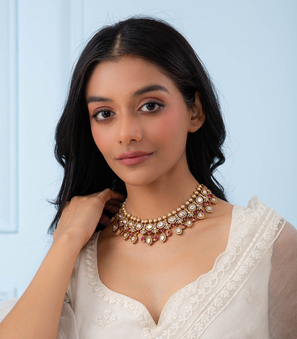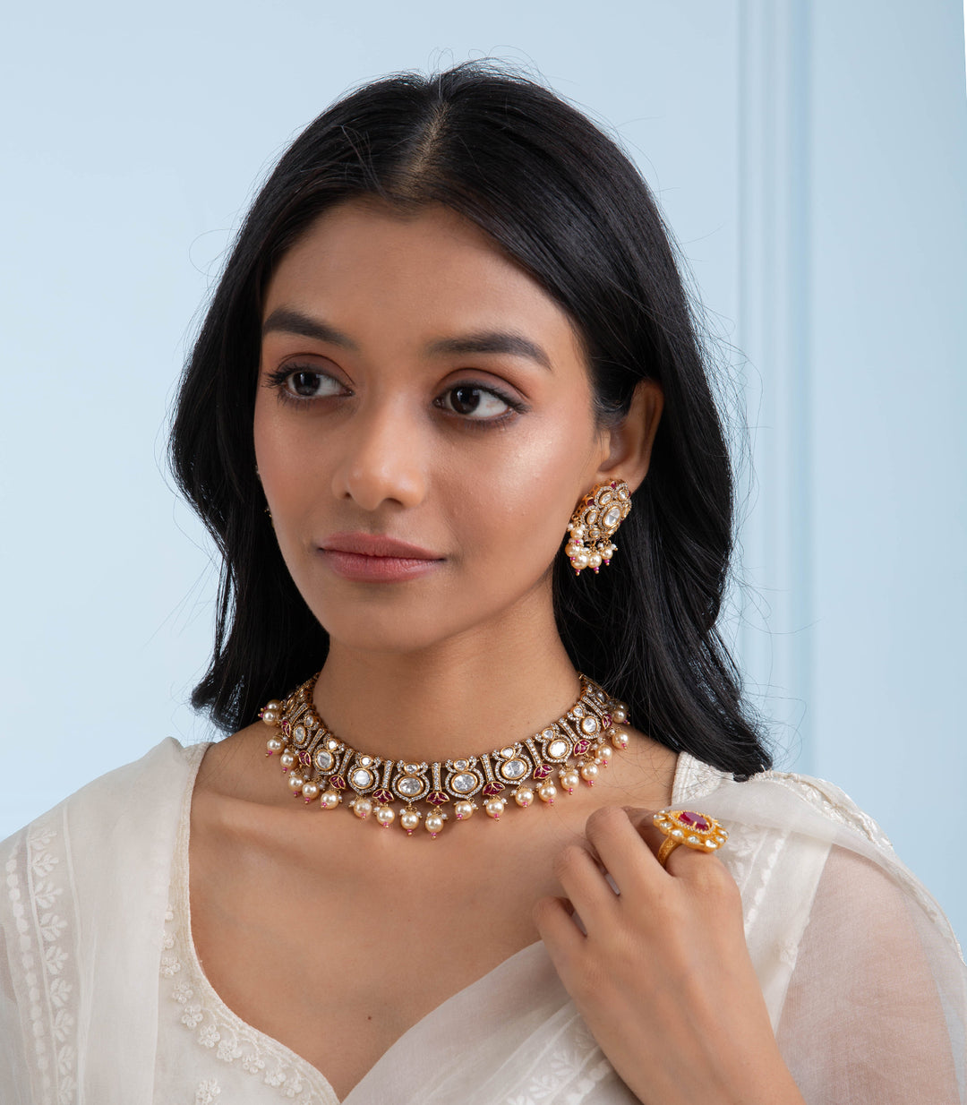 BHAVIYA ANTIQUE GOLD FINISH RED POLKI CHOKER SET