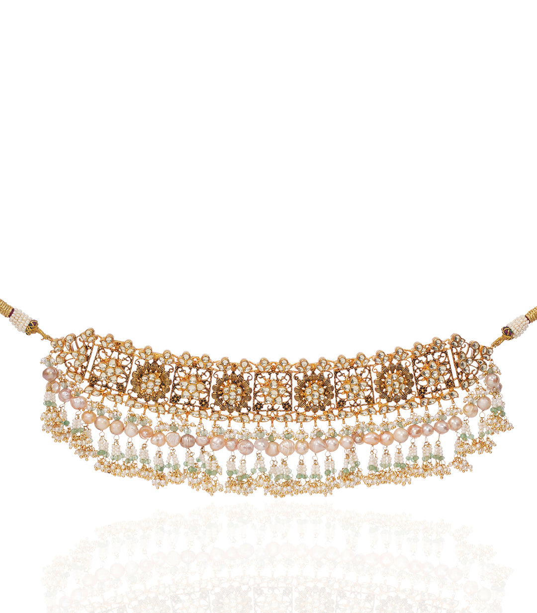 A chic brass maangtika, gold-plated and adorned with kundan stones, features graceful pearl drops. The couture-inspired design is elevated with a delicate string at the top, adding an elegant and sophisticated touch.